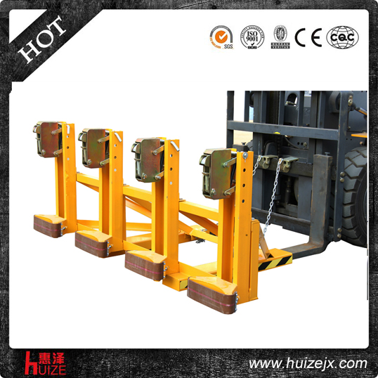 重型四油桶夾單鷹嘴DG2000A純機械機構設計可與叉車方便地配合,僅依靠叉車的動作,不需要其它的動力,可自動一次搬運4個鋼制油桶, 配置可拆換式柔性耐磨保護墊,有效保護油桶并緩沖叉車行駛過程中的震動, 能在集裝箱等這樣狹小的環(huán)境內裝卸桶裝物質,可極大地提高空間利用率, 與貨叉連接配有自鎖裝置確保油桶夾在坡度上和顛簸路面使用時不會滑落.
